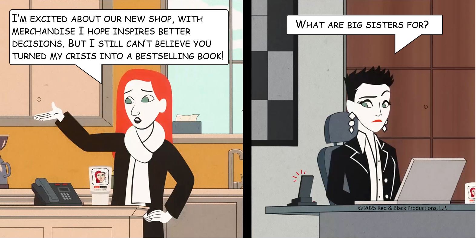 Well, it all started when Red, a warm and fuzzy mom, had a “crisis” (her word, not Black’s) and turned to her pragmatic big sister, Black, a retired corporate executive. She was hoping for a quick fix. Or, at least, a little sympathy.